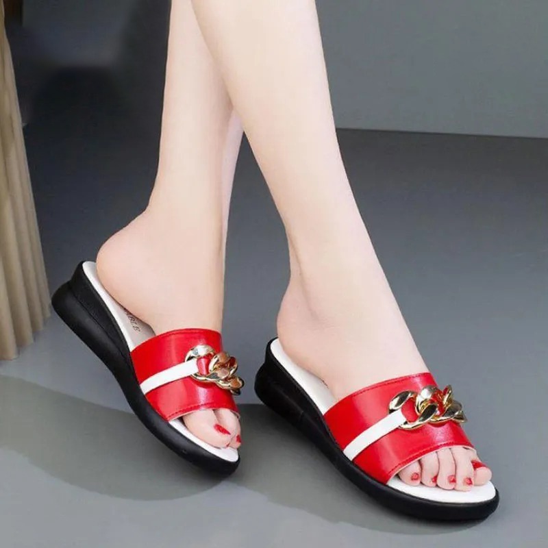 Step into opulent style with these Luxury Metal Wedge Sandals! Featuring a classic British silhouette embellished with gleaming metal accents, these slipper sandals offer a touch of sophistication for any woman. The comfortable wedge heel (3cm-5cm) adds height without sacrificing comfort, while the plush lining (likely a typo, not plutonium) ensures all-day wearability. The durable rubber sole provides traction on various surfaces, making them perfect for both indoor lounging and casual outings. Embrace timeless British style with a touch of modern luxury.
